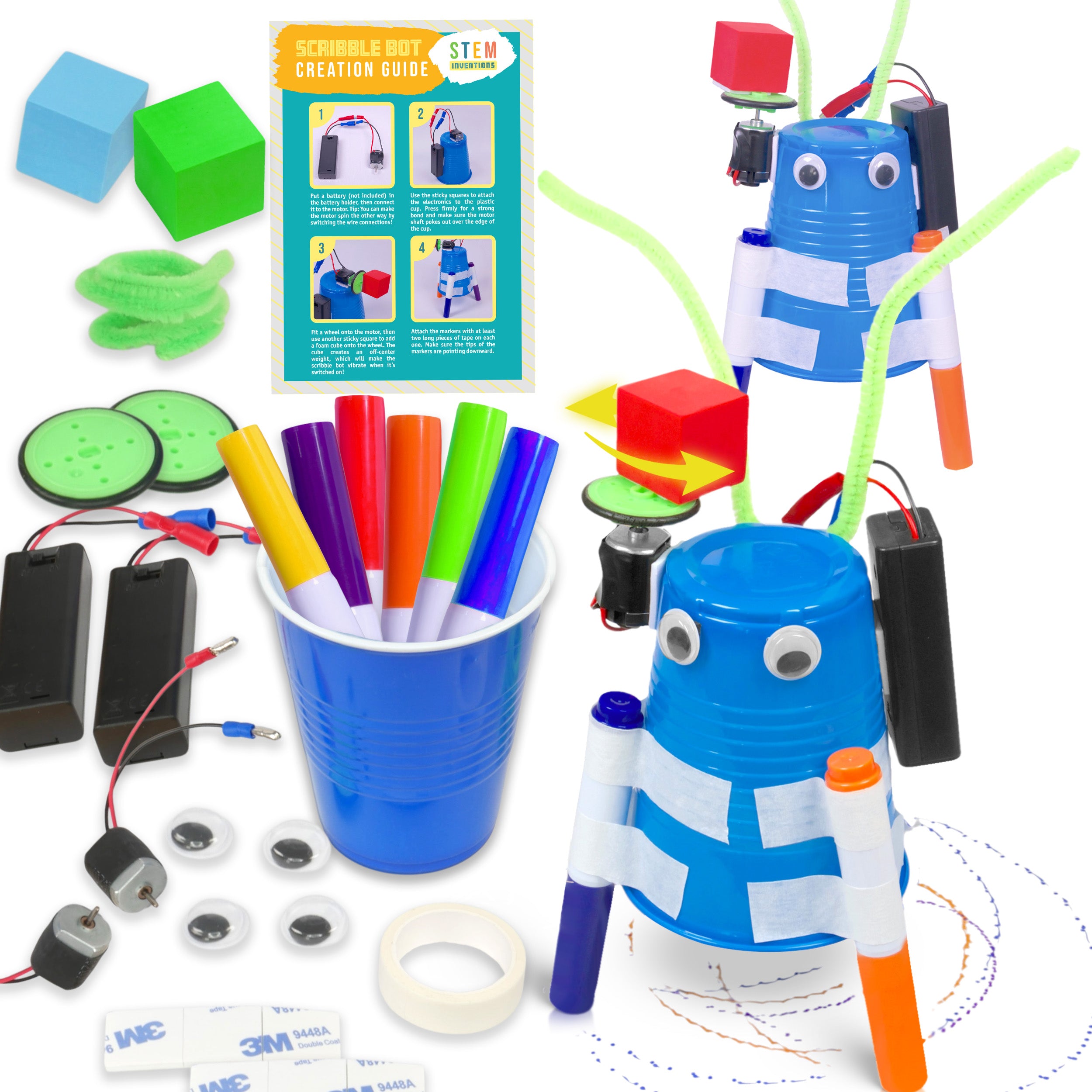 Complete DIY Kit: Each set includes all the supplies needed to build 2 motorized doodling, scribbling, drawing bots for kids in elementary and middle school.