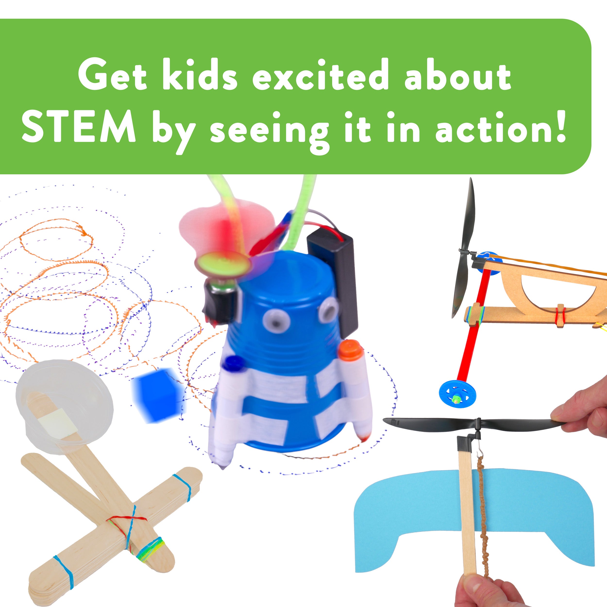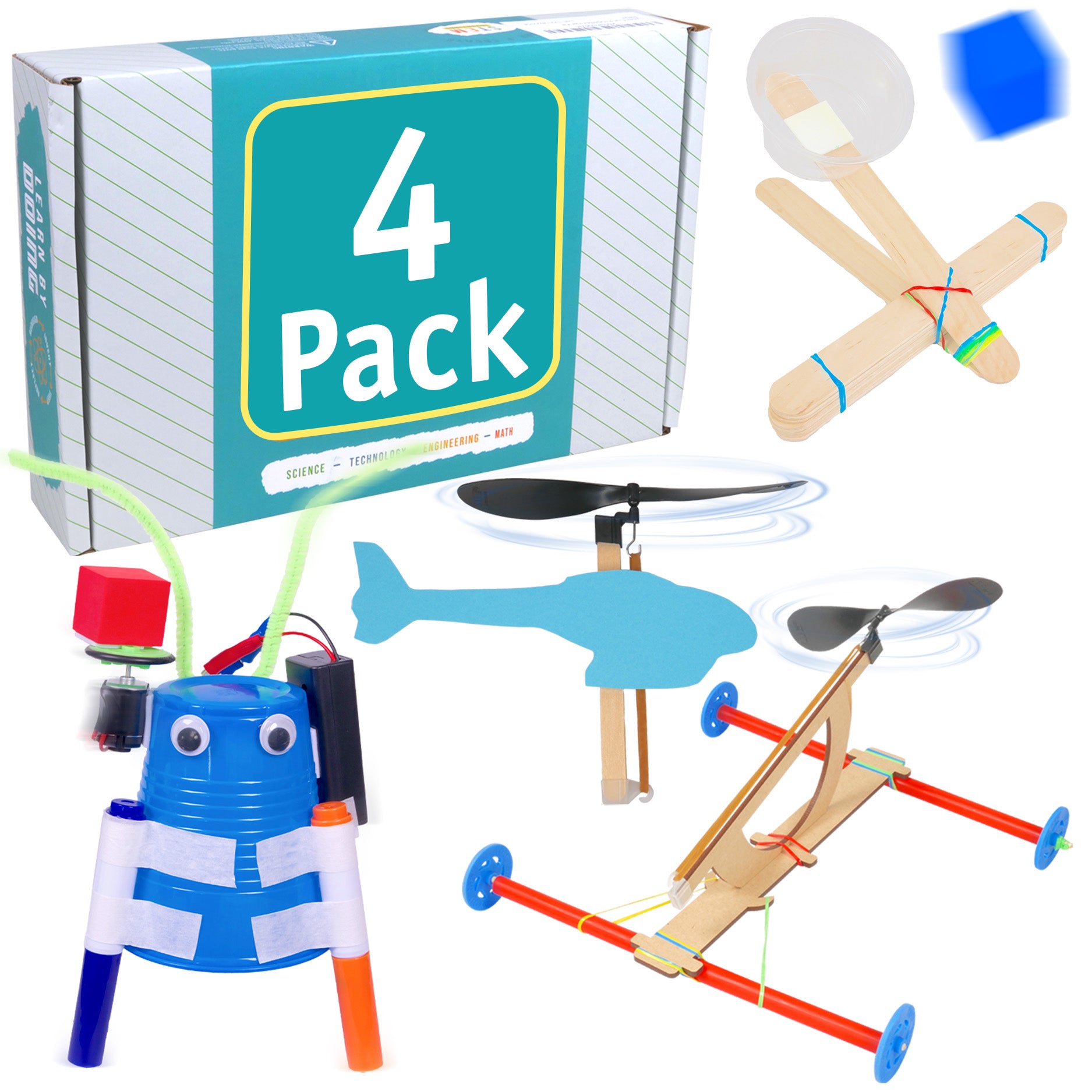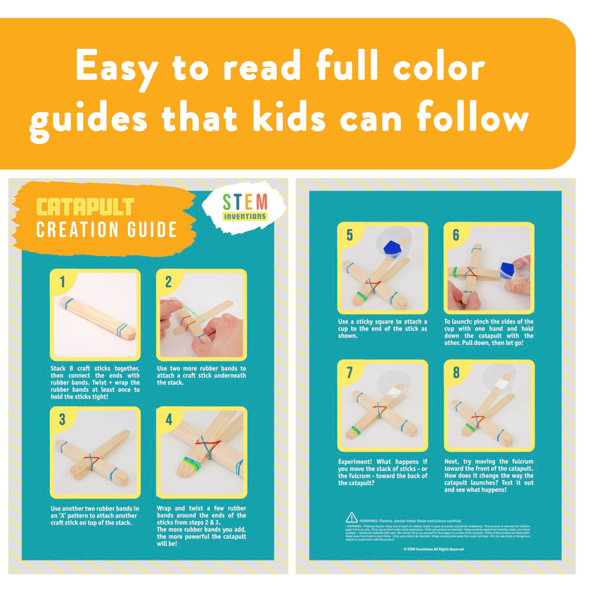 4-in-1 STEM Kit: Includes complete materials for a rubber band helicopter, motorized scribble bot, craft stick catapult, and propeller-powered car. This compact kit introduces kids to hands-on physics concepts like force, motion, and simple circuitry - ideal for hands-on STEM exploration across multiple disciplines.